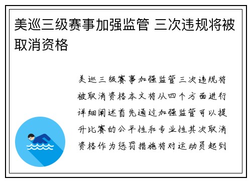美巡三级赛事加强监管 三次违规将被取消资格,本文将从四个方面进行详细阐述。首先,通过加强监管可以提升比赛的公平性和专业性。其次,取消资格作为惩罚措施将对运动员起到强大的震慑作用。第三,对于赛事组织方而...